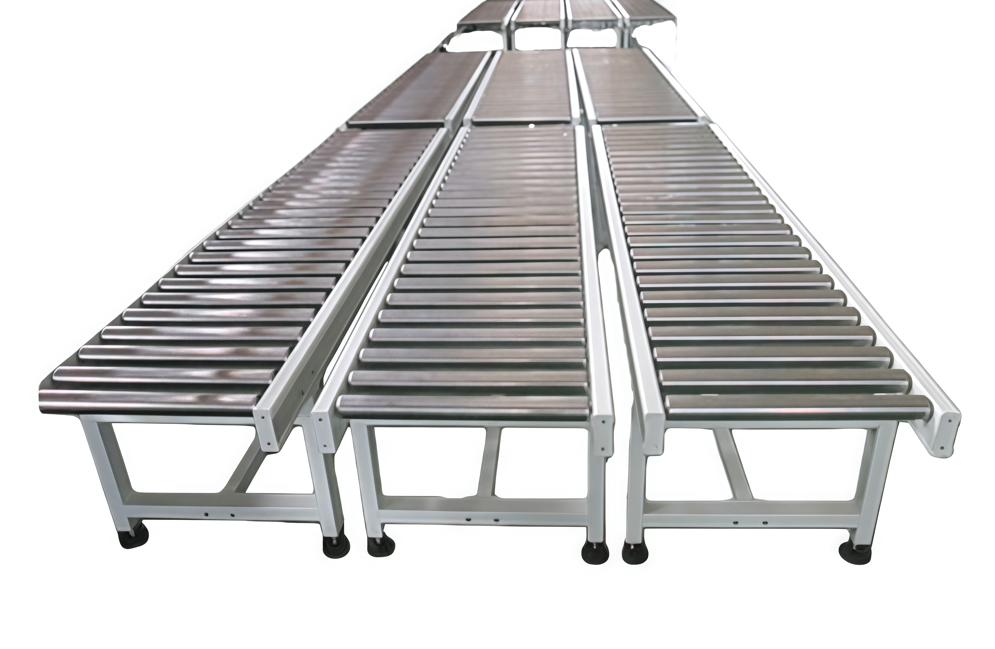 It is a material conveying equipment composed of rollers, frames, driving devices, rollers, and auxiliary accessories. It drives goods (such as cardboard boxes, pallets, turnover boxes, and other rigid parts) to move forward through the rotation of the rollers. It is widely used in material handling, sorting, loading and unloading in industries such as warehousing and logistics, food processing, e-commerce sorting, automobile manufacturing, and home appliance assembly. The number of drum segments and layout can be flexibly increased or decreased according to production needs. When adding sorting, packaging and other processes in the later stage, there is no need for large-scale equipment renovation, only corresponding auxiliary devices need to be installed, and the renovation cost is low. Whether it is small item sorting in e-commerce warehouses, component transportation in automobile factories, or finished product packaging lines in food factories, roller conveyors can be adapted and customized according to industry characteristics (such as stainless steel rollers+food grade lubricants used in the food industry). The rollers are made of high-quality steel or stainless steel, and after surface galvanizing and encapsulation treatment, they have excellent wear resistance and rust prevention performance; The welding process of the rack is mature and can withstand long-term heavy load operation