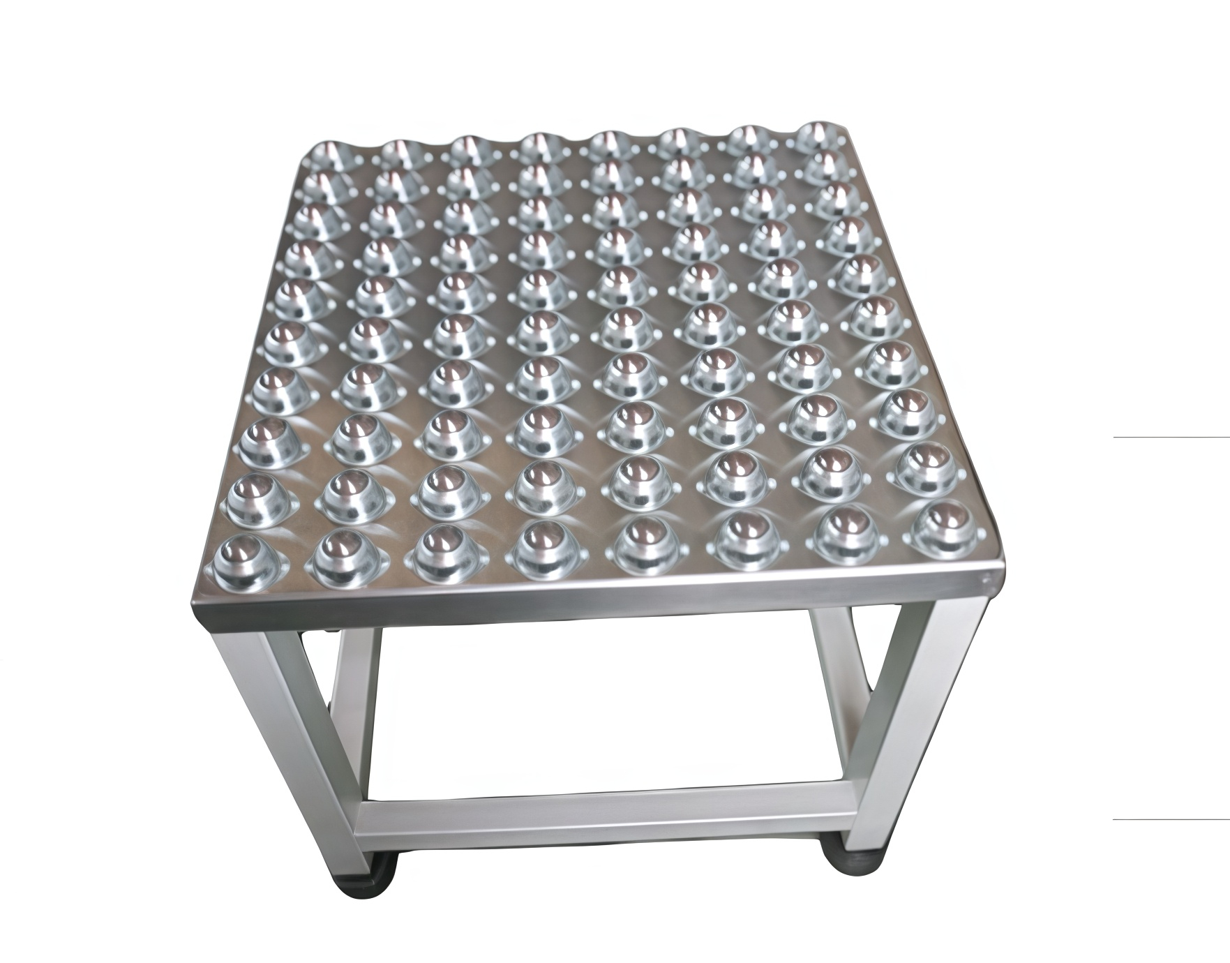 A lightweight material conveying equipment with a universal ball (bull eye wheel) as the core conveying unit, which can carry goods through densely packed universal balls and achieve flexible movement of materials in any direction. It is widely used in logistics sorting, home appliance assembly, electronic assembly, food packaging and other workstations that require manual adjustment of material posture or rapid reversal. The universal ball can rotate freely 360 °, and the goods placed on it (such as cardboard boxes, boards, and parts boxes) can easily achieve horizontal translation, steering, rotation, and other actions without the need for additional equipment. It is suitable for the frequent adjustment of material positions during manual assembly, such as quickly flipping workpieces during electronic component assembly and adjusting docking angles during household appliance panel installation. As a transfer platform for automated production lines, it can connect roller conveyors and belt conveyors in different directions, solving the problem of reversing materials between linear and curved conveyors; It can also serve as a temporary storage platform for sorting stations, facilitating manual scanning, labeling, and quick sorting of goods to the next process after quality inspection. At the assembly station, it can be used in conjunction with positioning blocks and stop bars to accurately fix materials in designated positions, making it easy for workers to perform operations such as screw tightening and component splicing; After completing the assembly, removing the positioning restriction can easily push the material to the next assembly line. Suitable for short distance transportation of lightweight and flat bottom materials, replacing manual handling, reducing the labor intensity of workers repeatedly bending and pushing, and improving workstation operation efficiency.